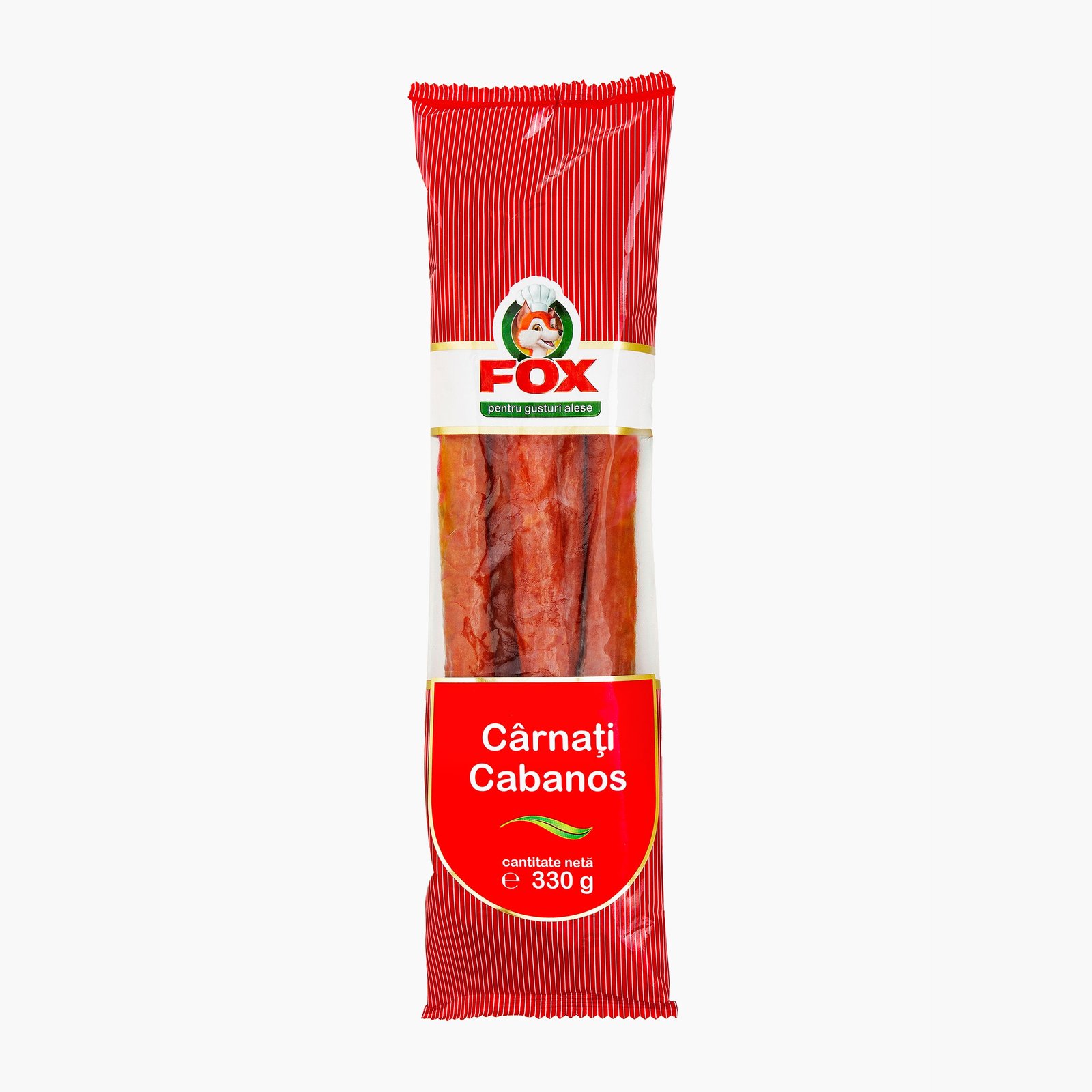 Fox Carnati Cabanos 330g – un produs romanesc savuros, cu gust echilibrat si aroma autentica, perfect pentru completarea gamei de mezeluri de calitate, disponibil prin AngroMarket.com.