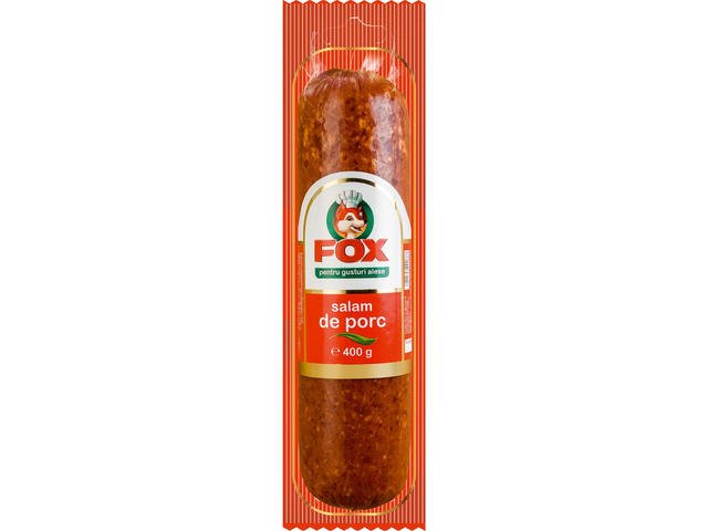 Fox Salam de Porc 400g este un produs traditional romanesc, preparat din carne de porc de calitate si condimente atent selectionate. Cu o aroma fina de afumatura si un gust echilibrat, acest salam se remarca prin textura sa ferma si consistenta uniforma, fiind perfect pentru consum zilnic sau ocazii speciale.